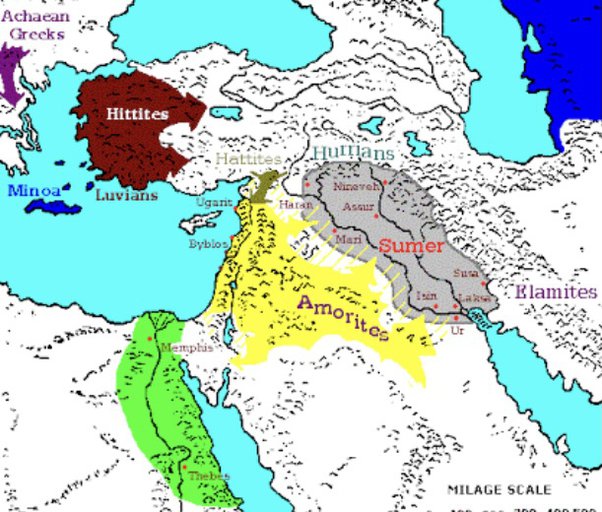The Amorites began to arrive in the territory to the west of the Euphrates (around Sumer on the map below), modern Syria. There was no actual invasion, but rather for a period of five hundred years they drifted down into southern Mesopotamia, integrating into Sumerian civilization where they lived in enclaves.